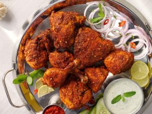 -In a bowl,add yogurt,ginger garlic paste,orange food color,cornflour,prepared spice mix (reserve 1 & ½ tbs for later use),soy sauce,chilli sauce,lemon juice & mix well.