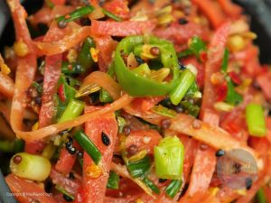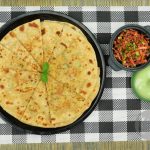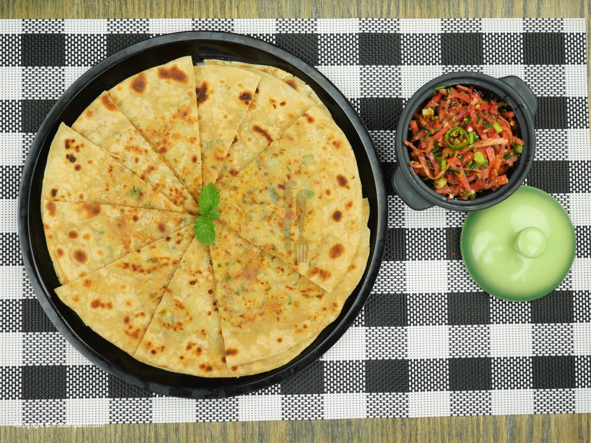 Roll out another dough and put filling/stuffing in the center, place another round dough on top, seal edges and roll out carefully with the help of rolling pin.