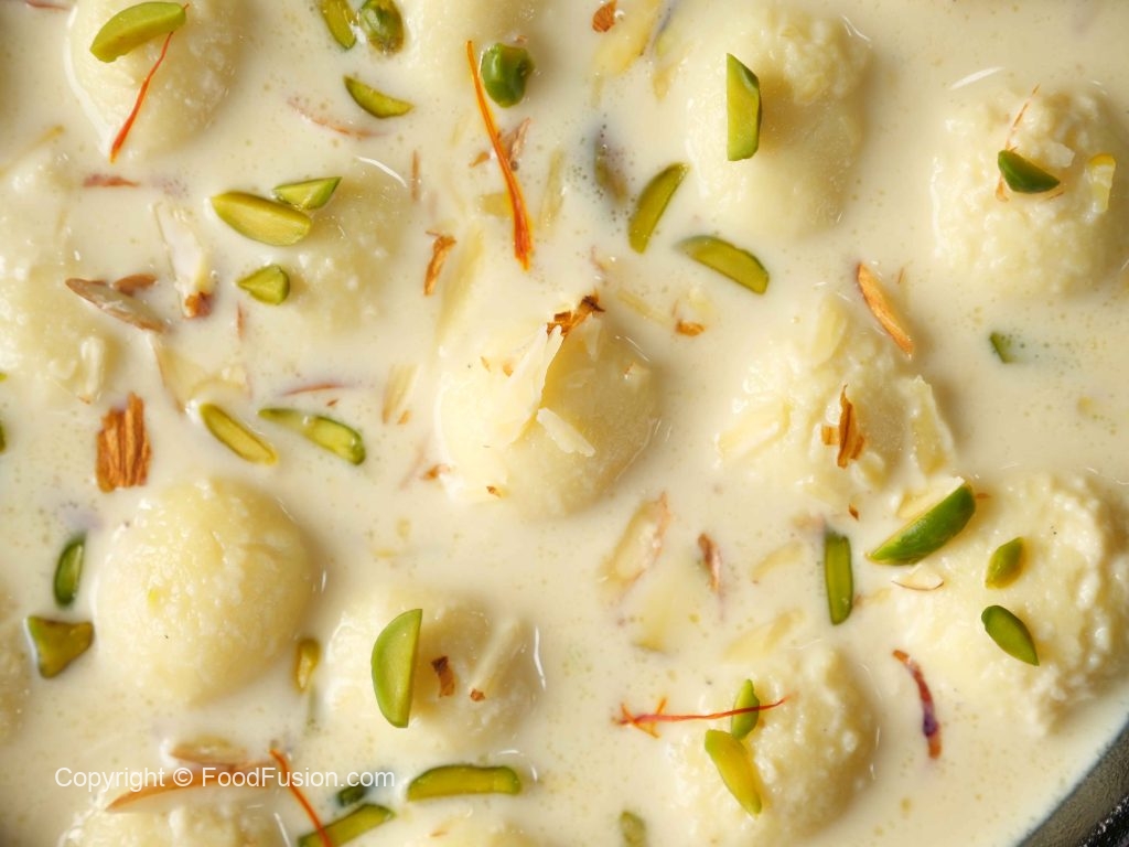 -In boiling milk,add prepared balls & cook on very low flame until they float on the surface & increase in size (don’t stir),cover & cook on low flame for 10 minutes.