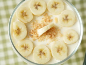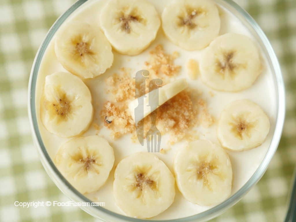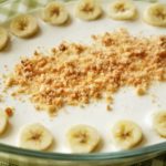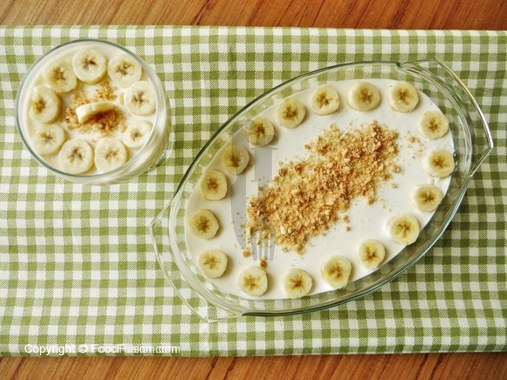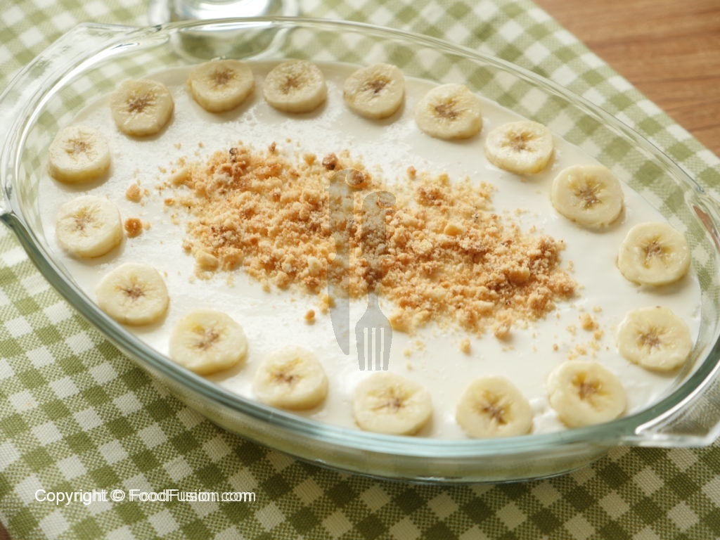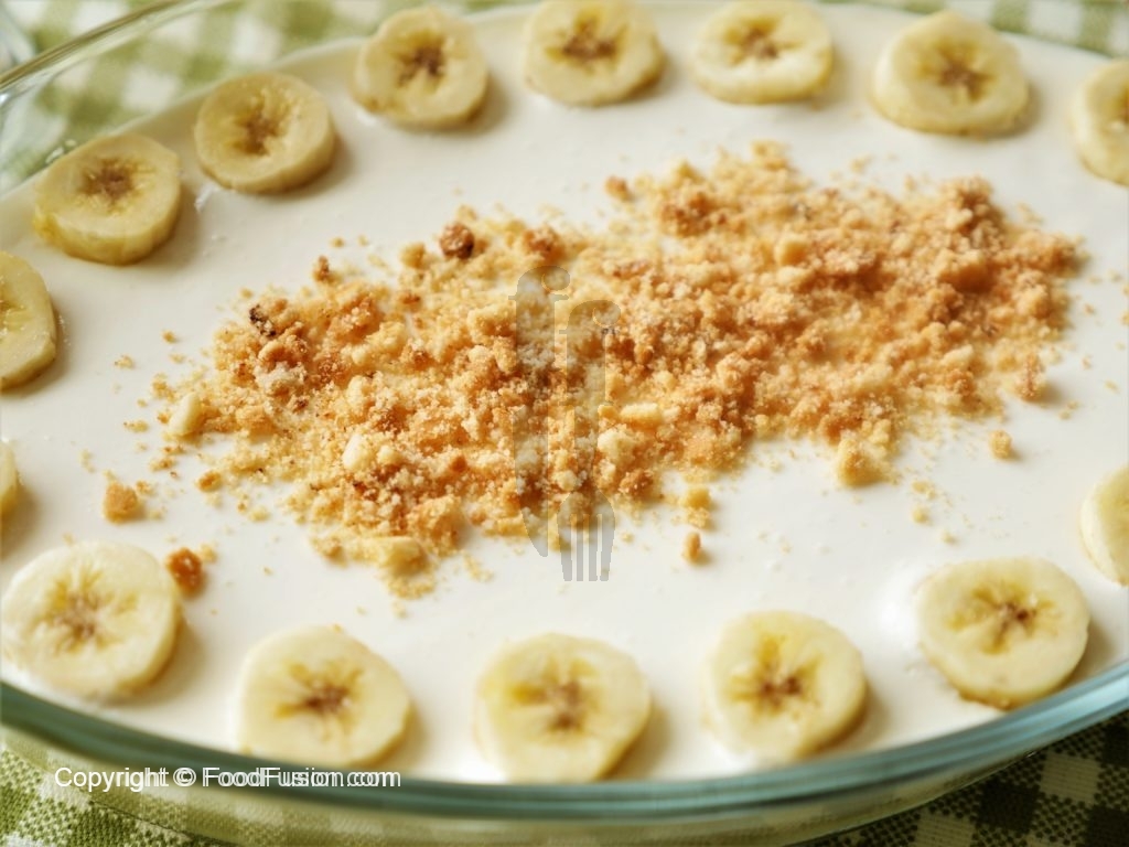 In serving dish,arrange sliced bananas and biscuits evenly.