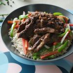 Serving dish mein cooked rice,stir fried vegetables,fried beef strips aur tayyar sauce drizzle ker ka serve karein!
