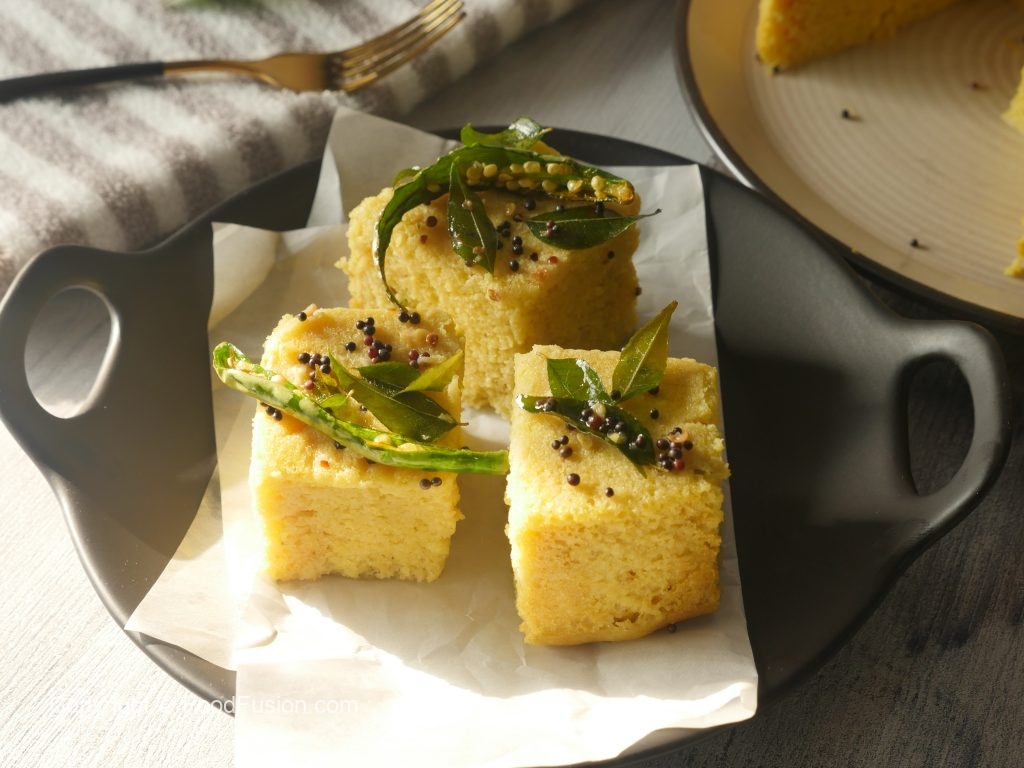 Cut into square pieces and pour tadka evenly on the dhoklas & serve!