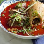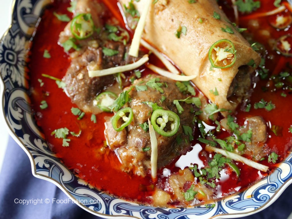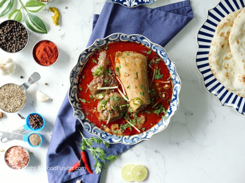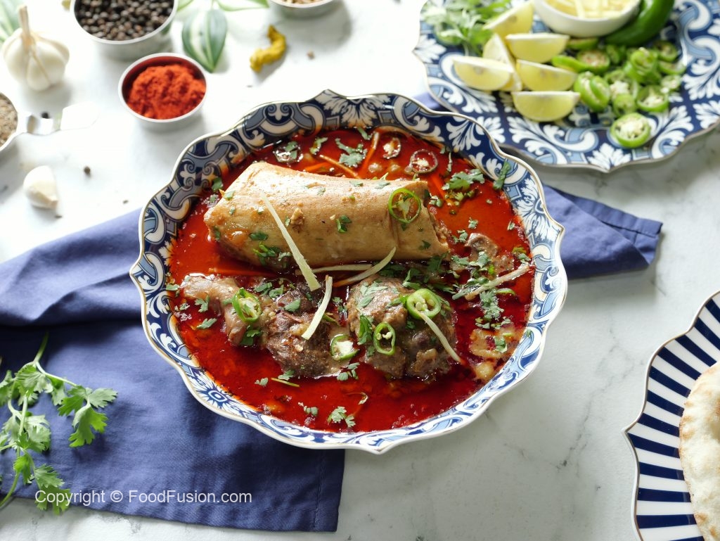 -Pour reserved oil (tarri) on nihari,garnish with green chillies,fresh coriander,ginger & serve with naan!