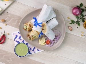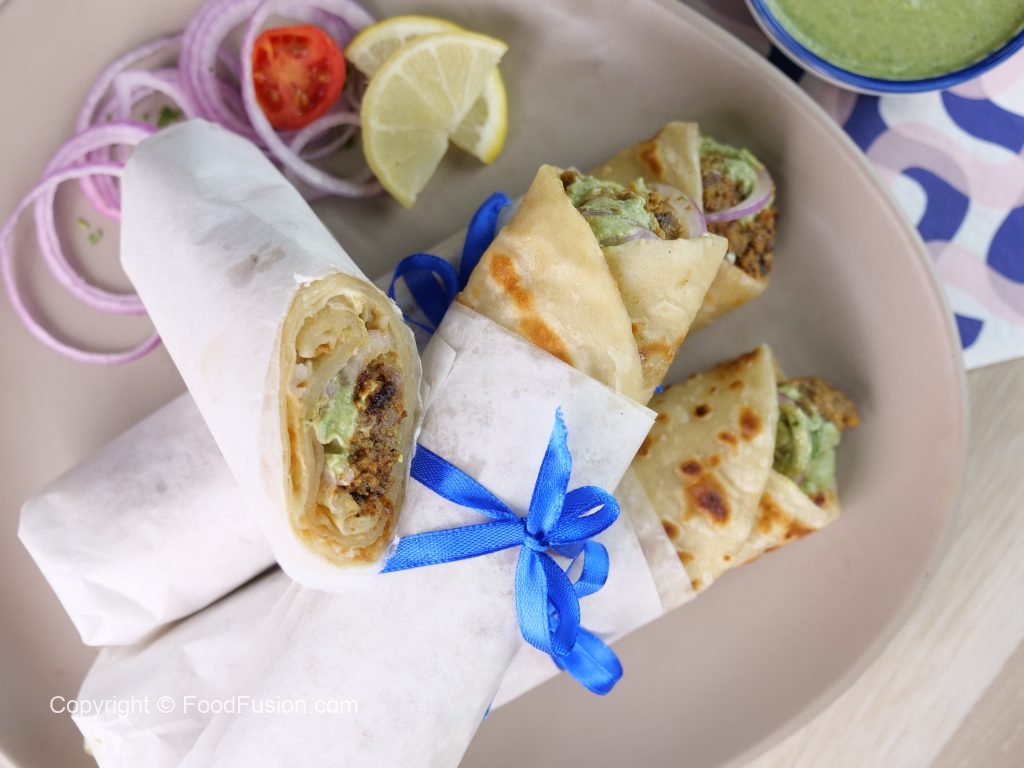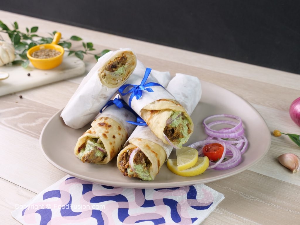 On a paratha,add & spread mayonnaise,prepared bihari boti,onion rings,green chutney,fresh coriander,roll out paratha & wrap in butter paper (makes 4).