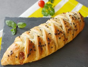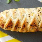 With the help of the brush,apply egg on braided bread and sprinkle black sesame seeds.