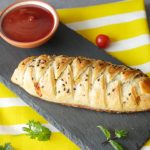 Braid ki tarhan overlap kertay hoye bread ka cuts ko alternately bundd kertay jayein (makes 4-5).