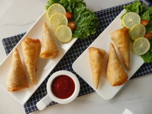 Take samosa wraps,apply flour paste and make pocket,add chicken filling in the center and fold into the shape of cone and apply flour mixture on the edges and bring the edges together and seal the edges properly (makes 14-15).