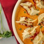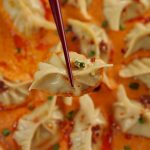 -On serving plate,pour prepared butter chicken sauce,place prepared dumplings,pour chilli oil,green onion leaves & serve!