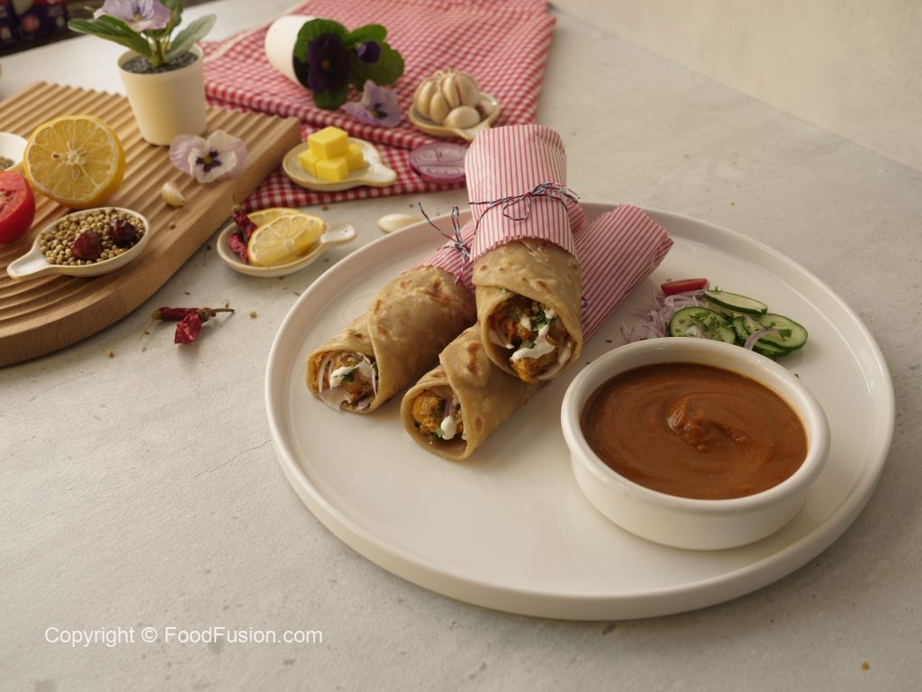 Paratha per butter chicken,pyaz,hara dhania aur cream dal dein,roll ker ka butter paper mein wrap ker lein aur chutney ka saath serve karein (makes 6).