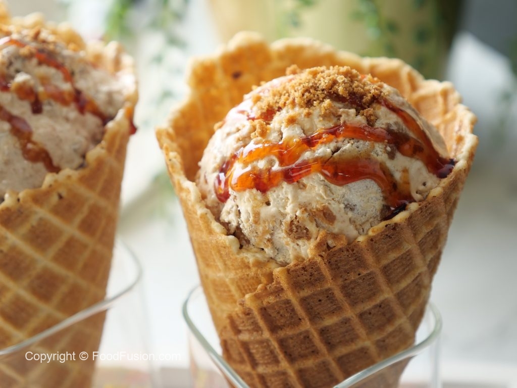 -Once frozen completely,scoop out,drizzle caramel syrup,add crumbled candi biscuits & serve!