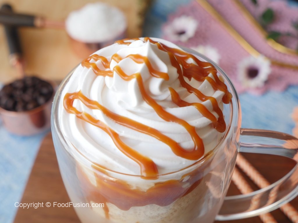 Serving glass k sides pe caramel sauce daalen or caramel Frappuccino glass may nikal len.
