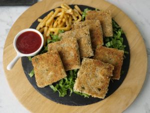Cut into four pieces and coat potato side of bread slice with breadcrumbs (makes 8 bread slices).