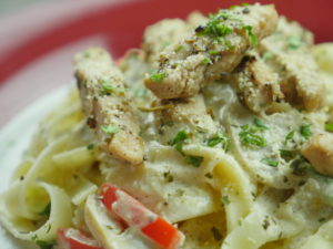 For Plating, add pasta first, then pour alfredo sauce, sprinkle cooked chicken and lastly add parmesan cheese and parsley on top for garnishing.
