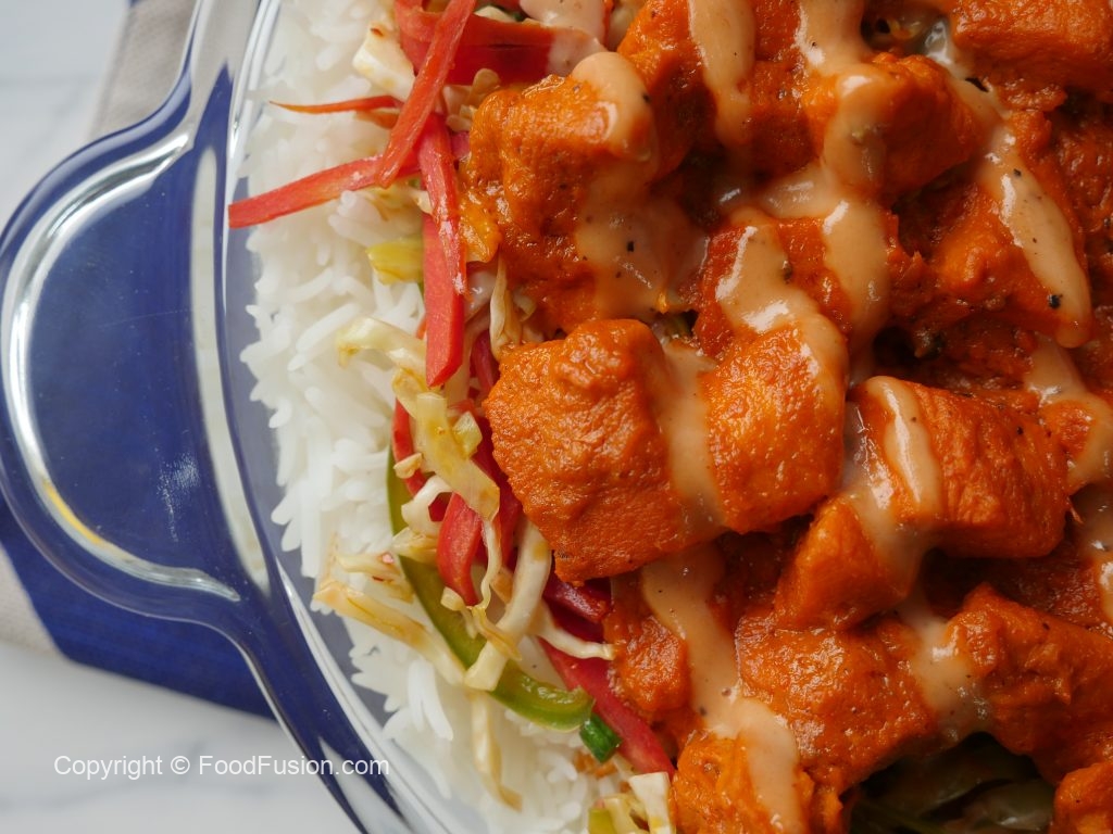In serving dish,add boiled rice,red chili+garlic tadka,cooked vegetables,cooked tandoori chicken and drizzle prepared sauce & serve!