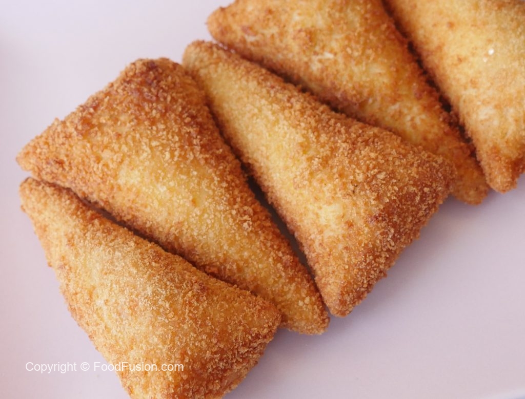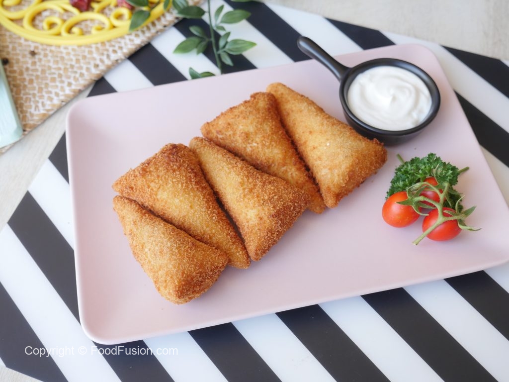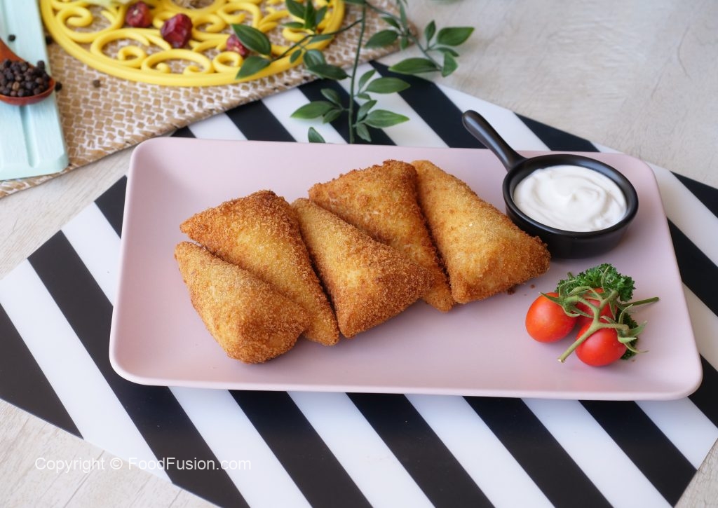 Brush flour slurry on one side of bread and fold bread slice to make a cone,add chicken filling (1 & ½ tbs),mozzarella cheese (1tbs),apply flour slurry on the edges and bring the edges together and seal the edges properly.