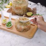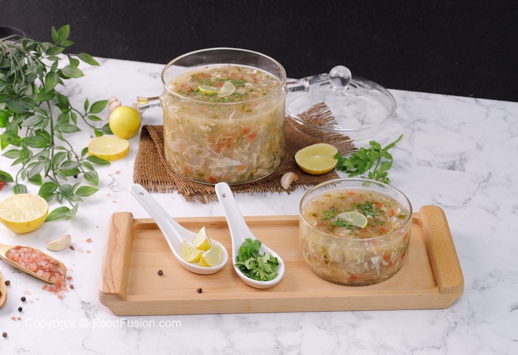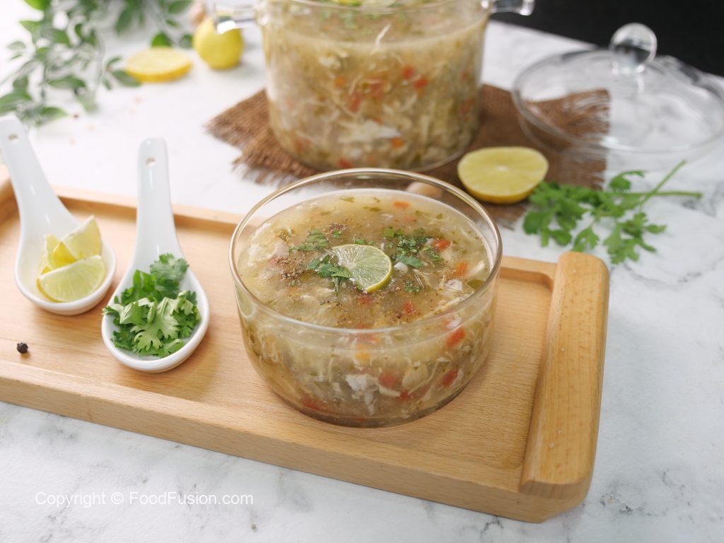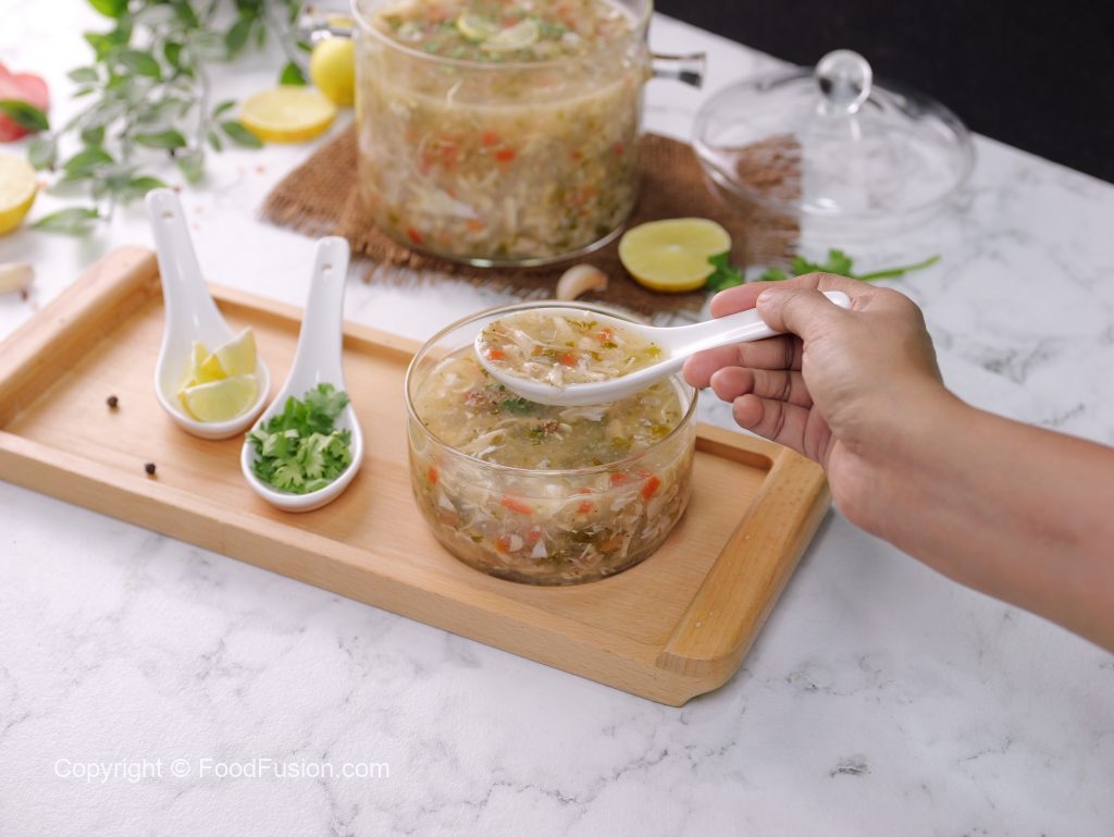 -In a serving bowl,add lemon juice,prepared soup,black pepper crushed,fresh coriander,lemon slice & serve hot!