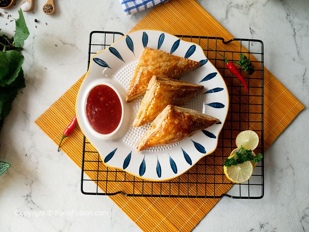 On each puff pastry square,add prepared filling & egg wedge in the center (skip egg if storing),apply water on the edges,flip the other side & press the edges to stick together and prick with fork to seal the edges (makes 18).