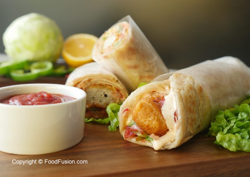 On paratha,drizzle tomato ketchup,stir fried vegetables,fried chicken nuggets and drizzle prepared cream & cheese sauce,warp in butter paper & serve!