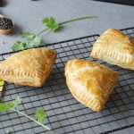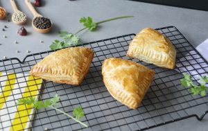 Add & spread chicken filling,place another paratha part,repeat the same layer and seal edges with fork & apply egg wash (makes 12).