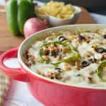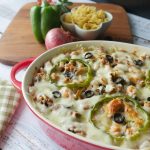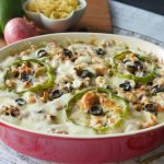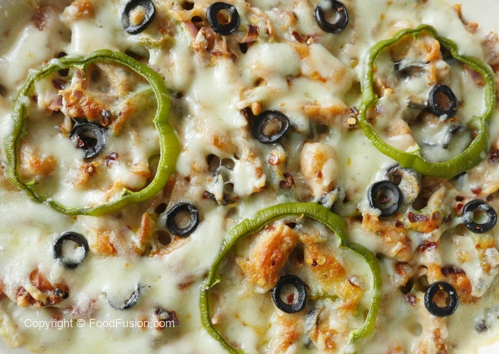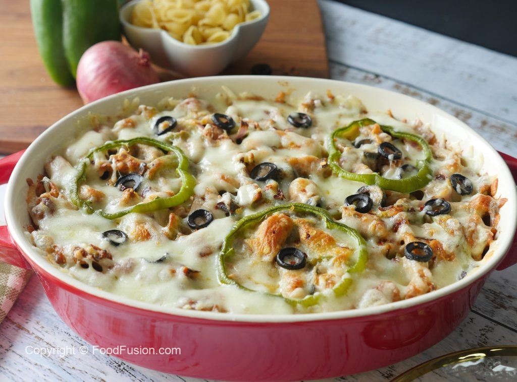 Grease baking dish with oil,add & spread pasta,chicken & vegetable topping,cheddar cheese,mozzarella cheese,capsicum,black olives and sprinkle red chili crushed.
