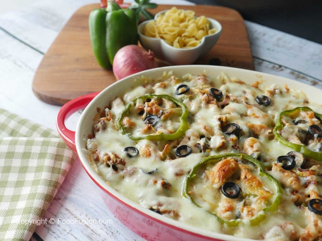 Baking dish ko oil sa grease karein,pasta aur chicken & vegetable topping dal ker pheela lein,cheddar cheese, mozzarella cheese,shimla mirch,black olives aur lal mirch crushed dal dein.