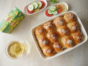 In baking dish,place burger buns,add tomato ketchup,cheddar cheese,cooked chicken mixture,pickled cucumber,onion slices,mozzarella cheese slices and cover with top buns.