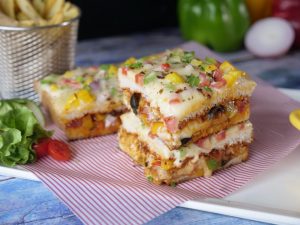 On burger bun,add chutney,salad leaf,grilled chicken fillets,onion,tomato ketchup and tomato slices.