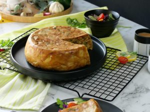 -Spring roll pastry ko anday ka mixture mein dip karein aur layers laga ker chicken tikka filling cheddar cheese & mozzarella cheese dal dein.Repeat 2 layers of roll sheet & filling.