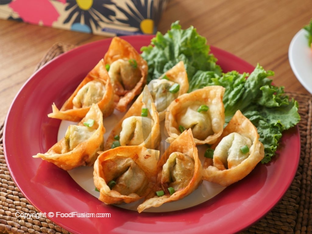 Triangle ka ek side per anda laga lein aur overlap ker ka wonton ki shape bana lein (makes 25-30).