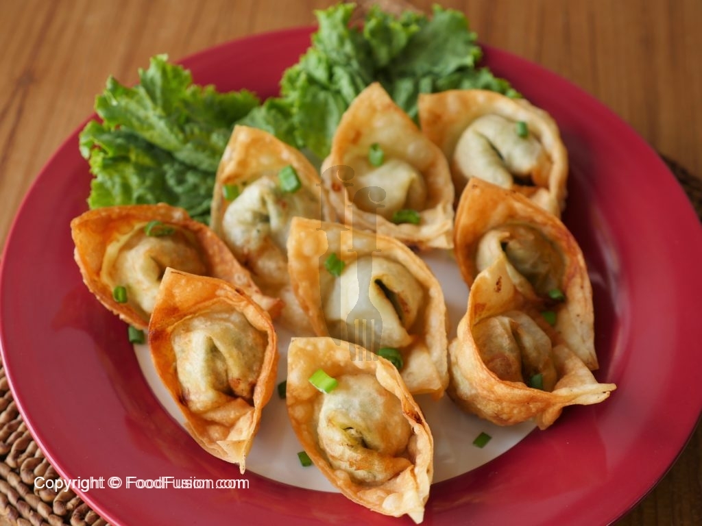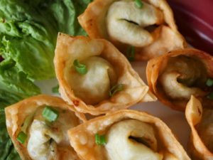 Apply egg on one side of triangle and overlap to form wonton shape (makes 25-30).