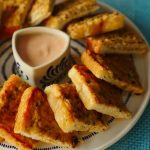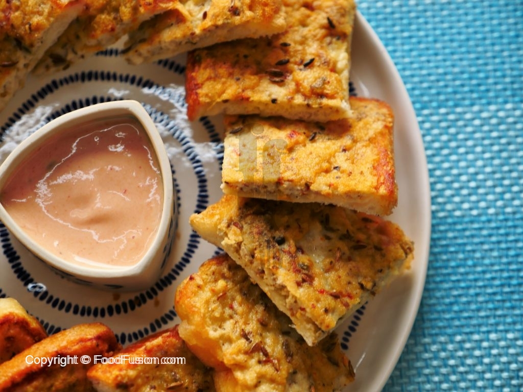 In frying pan, add oil and place bread slices (spread side downwards) and fry for 4-5 minutes on low flame.