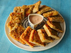 Spread prepared chicken mince on bread slices, sprinkle cumin seeds and press slightly.