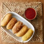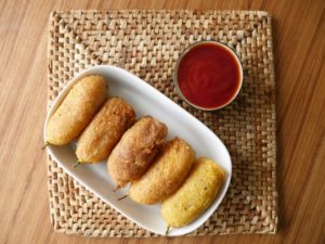 In green chilies,add masala mix or mozzarella cheese with masala mix,coat with potato coating then dip into pakora batter.