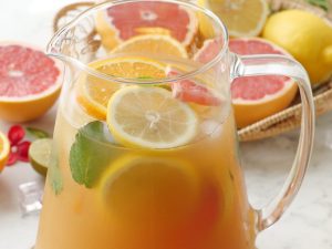 Jug mein ice cubes,lemon slices,orange slices,grape fruit slices,tayyar lemon green tea,grape fruit juice,orange juice,lemon juice aur podina dal ker stir ker lein & serve karein!