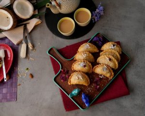 Brush oil on creamy coconut samosa & bake in preheated oven at 200C for 20-25 minutes (flip in between once after 15 minutes).
