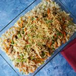 Serving dish mein fried rice,crispy fried chicken with vegetables aur fried egg noodles,hara pyaz ka leaves dal ker serve karein.