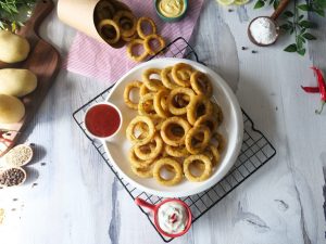 -In a frying pan,heat cooking oil and fry potato rings on medium flame until golden.