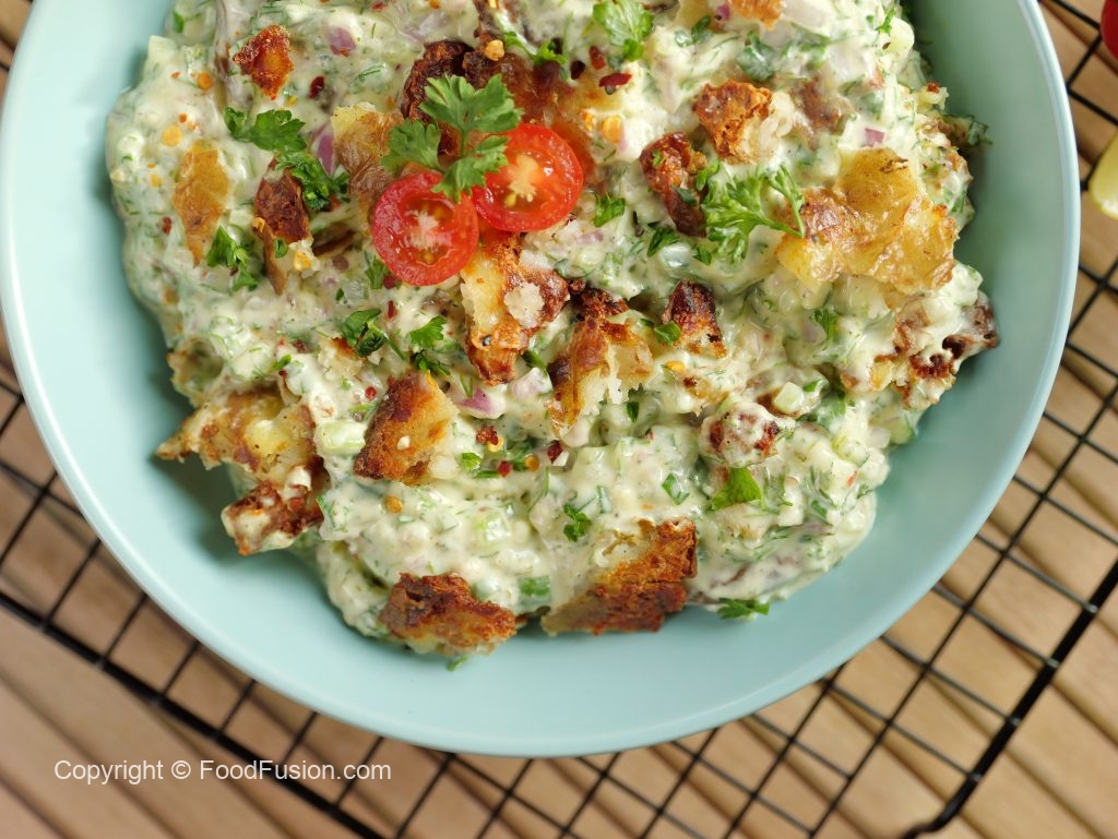-Air fried potatoes ko crush ker ka salad bowl mein dal dein aur mix ker lein.