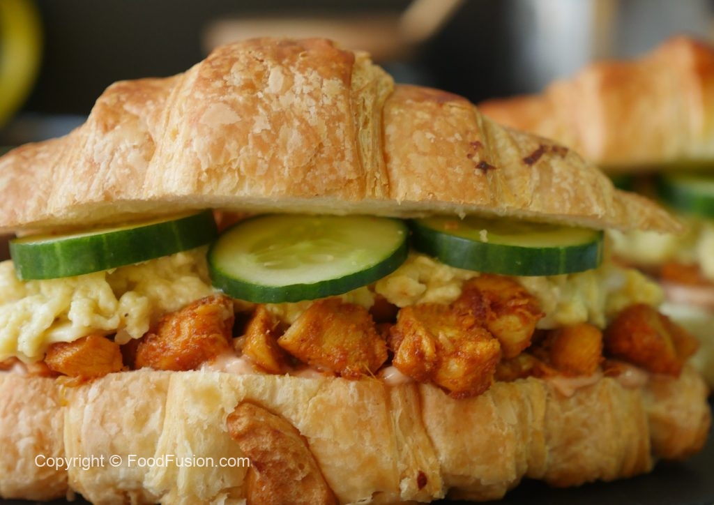 Add prepared mayo sauce,chicken tikka cubes,cheese slices,prepared scrambled eggs,cucumber slices & croissant on top (makes 3-4).