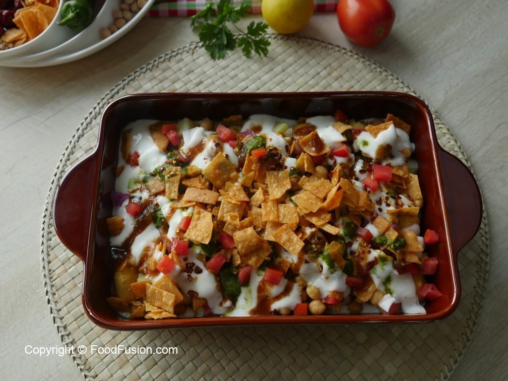 Serving dish mein dahi,phulkiyan,lal mirch crushed,chaat masala,aloo,chanay,tamatar,pyaz,meethi chutney,hari chutney,papri,dahi,meethi chutney,hari chutney,lal mirch crushed,tamatar aur papri dal ker serve karein!
