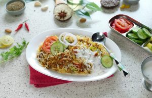 -In a pot,add 1/3rd portion of boiled rice,cooked lentil mixture,fresh coriander,green chillies, remaining boiled rice,fried onion,green chillies,fresh coriander & clarified butter.