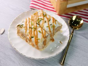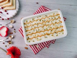 -Add prepared thick milk,pistachios,almonds,caramel sauce,soaked bread slices,thick milk, pistachios,almonds,caramel sauce,soaked bread slices & thick milk.