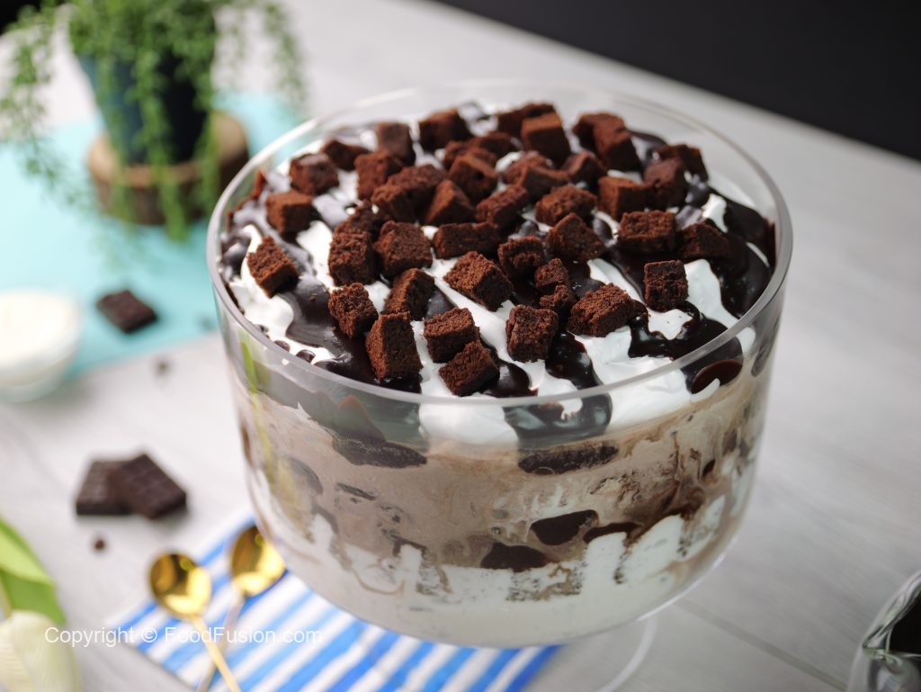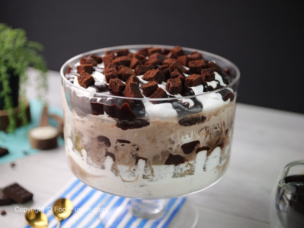 -Add prepared hot fudge sauce,brownie pieces & brush prepared coffee mixture on brownie pieces.