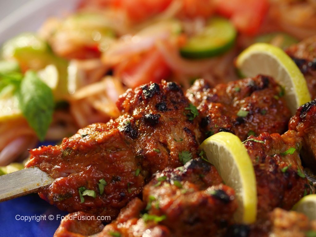 -Marinated beef ko metal skewers par lagayein (makes 6).