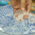 Put the cornflour mixture in squeeze bottle/piping bag,press the hot corn flour mixture though squeeze bottle into ice chilled water such that the strands of noodles are immersed completely in the cold water.