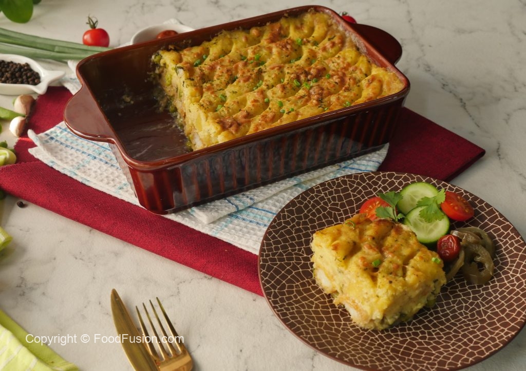 In a 10 x 4 inch baking dish layer prepared sauce, fried fish, mozzarella cheese, cheddar cheese & prepared creamy potato. Level it with the help of spoon & make some design.
