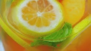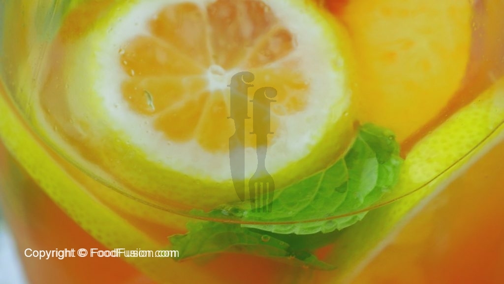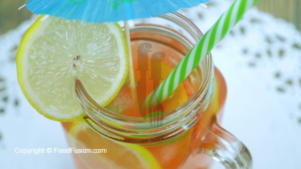 In serving glass, add peach and lemon slices, pour peach mixture, cold water and lemon juice.