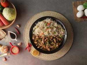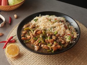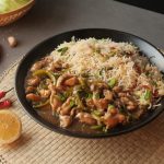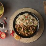 -Fried rice ko Chicken Mongolian ka saath serve karein.
