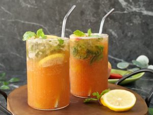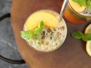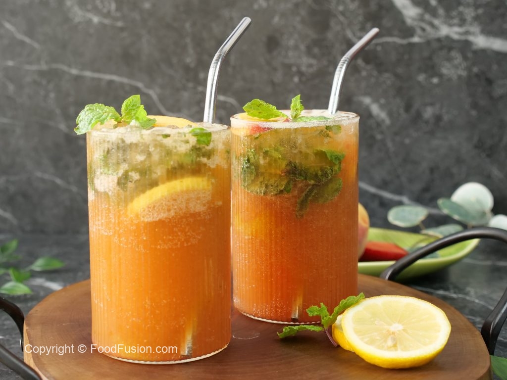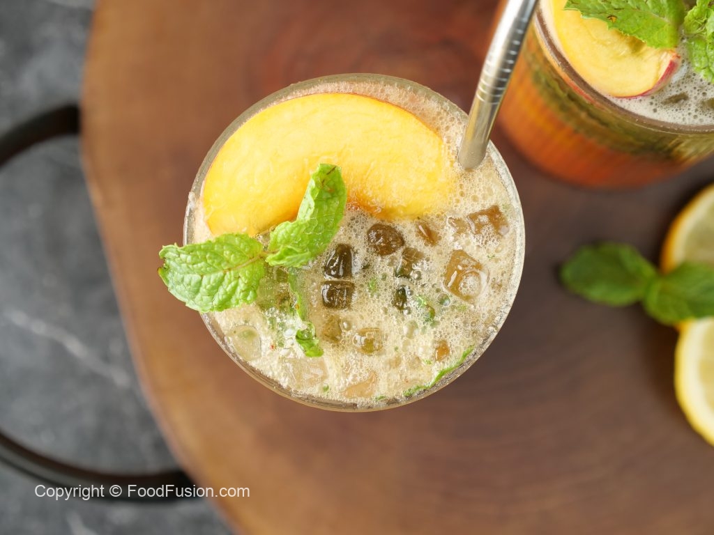 -Garnish with peach slice,mint leaves & serve!