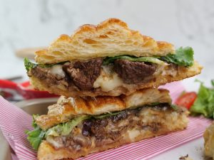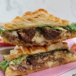 -Grease grill pan with butter & grill croissant,add cheddar cheese slice,mozzarella cheese,cooked beef,prepared spicy bbq burger sauce,caramelized onion & lettuce leaves.